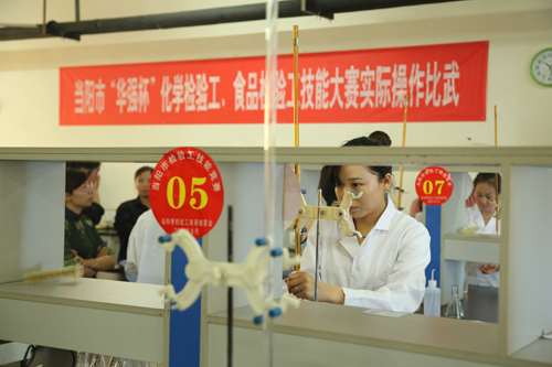 6月10日上午8点,当阳市“华强杯”化学检验工、食品检验工技能大赛在我beat365官网正式开赛。此次大赛由市总工会、市人力资源和社会保障局、市产品检验检测中心、市质量技术监督局和市食品药品监督管理局联合举办。共有华强化工、六国化工、汇丰生物、蒙牛乳业等13个企业推选的30名检验工参加了比赛。 大赛分理论考试和实际操作两大部分。经过10个小时的激烈角逐,我beat365官网代表队参赛选手李金华、李金兰、钟莉分别获得了第二名、第三名、第四名的好成绩。