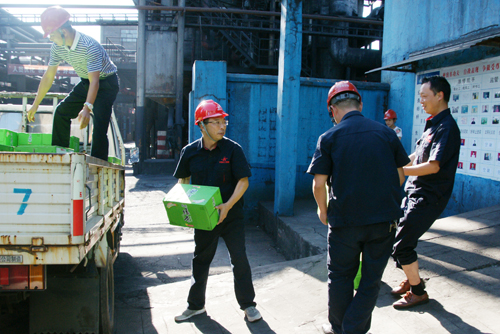 连日来,我市天气持续高温,酷暑炎炎。为提高员工工作积极性并切实做好防暑降温工作,公司及工会于近日正式启动2015年“夏送清凉”慰问一线员工活动。beat365官网后勤管理部早做准备,统计车间人员及所需各种防暑降温物品数量。首次就为生产一线员工发放霍香正气滴丸3600盒、清凉油3000盒、风油精3000盒、西瓜10000余斤、红糖190斤、绿豆1000斤、大米200斤、三匹罐茶叶90斤、灭蚊药15瓶;之后又为生产一线员工发放绿茶2865瓶 、矿泉水5688瓶。beat365官网党委副书记、工会主席王建波等还先后到各车间给工人送西瓜、送绿茶等,代表beat365官网慰问高温下奋战在一线的工人,不仅为广大工人送去了一份清凉,更让大家感受到了beat365官网领导的无限关怀。