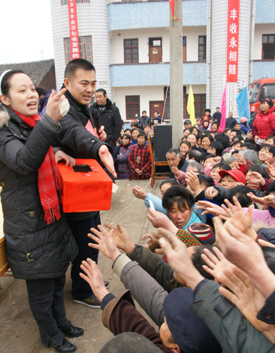 3月6日上午,集团beat365官网党委副书记、工会主席王建波同志代表董事长、总经理余华强同志将beat365官网生产的20吨、价值6万余元的复合肥送到两河镇双龙村村民的手中。这是我beat365官网今年开展“反哺三农、送肥下乡春风行动”的又一新举措。近2个月来,我beat365官网和当阳电视台垄上行栏目组联合在我市各乡镇开展20余次送肥下乡、有奖销售获奖客户联谊活动。